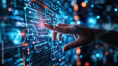 Digital technology, internet network connection concept. Finger touching on virtual screen with futuristic technology background, data exchange, digital transformation