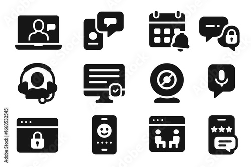 Digital Therapy Icons. Solid style icons of online and digital therapy: therapist on laptop screen, mobile therapy app icon,