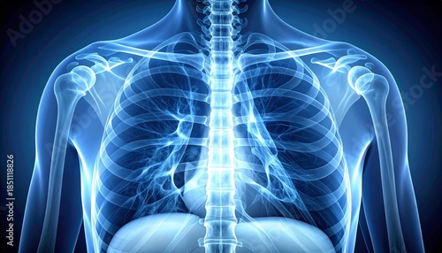 Digital Thoracic Cavity Rendering Showing Ribcage, Spine, and Semi-Transparent Lungs with Bronchial Structures