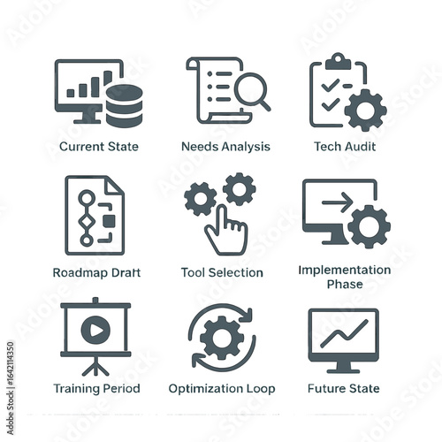 Digital Transformation Icons. Flat icon set of digital transformation timeline: current state, needs analysis,