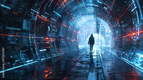 Digital Tunnel A Silhouette Walks Through a Sci-Fi Data Stream