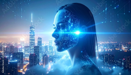 Digital visage overlooks a futuristic metropolis