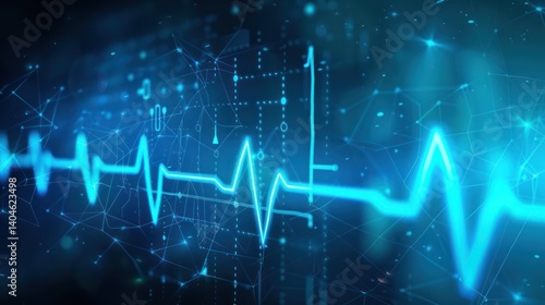Digital visual of heartbeat pulse neon blue line, EKG cardio line on blue background. Generated AI