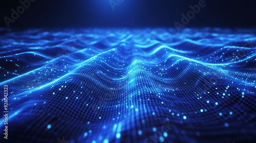 Digital Wave: Abstract blue light particles ripple across a dark background, creating an ethereal and mesmerizing visualization of data flow and technological evolution.