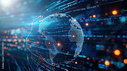 Digital world globe representing global network and connectivity on Earth, featuring high-speed data transfer, cyber technology, information exchange, and international telecommunications.