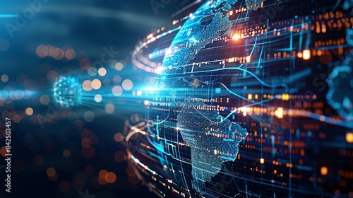 Digital world globe representing global network and connectivity on Earth, featuring high-speed data transfer, cyber technology, information exchange, and international telecommunications.