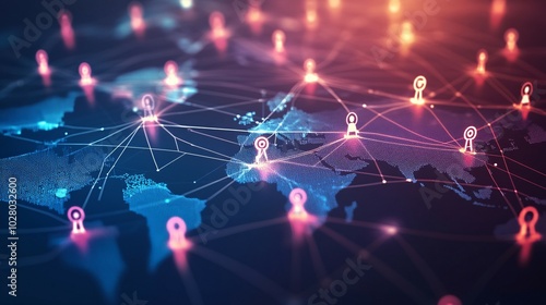 Digital World Map with Interconnected Nodes and Glowing Pins