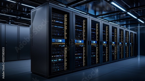 Digitalization of Internet traffic, Data Flow and Complex Electric Equipment Warehouse. Modern Data Technology Center Server Racks with VFX.