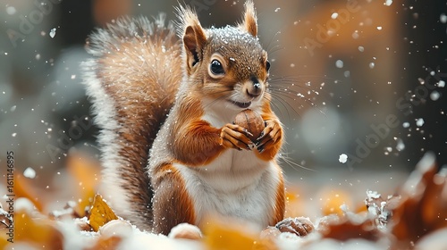 Diligent squirrel gathering nuts under frosted branches in a snowy forest