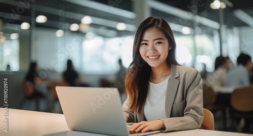 diligent young woman works seamlessly in her office, dedicated to her tasks and engaged with her laptop. Generative AI.