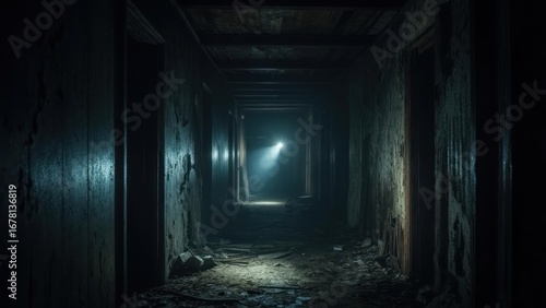 Dim, abandoned hallway, light beam