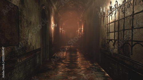 Dimly Lit Haunted Hallway with Eerie Atmosphere and Shadows