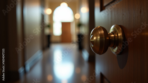 Dimly lit school hallway with brown door and round handle in shallow focus