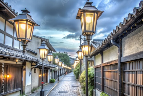 Dimly Lit Street with Cobblestone Path and Lanterns