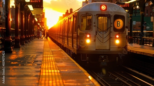 Dimly lit train platform with a single subway car waiting under fluorescent lights