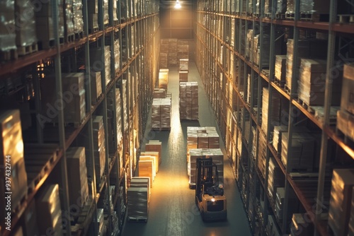 Dimly Lit Warehouse Aisle with Forklift and Stacked Pallets