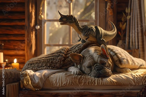 Dimorphodon Companion Rests Atop Sleeping French Bulldog in Cozy Rustic Cabin Interior
