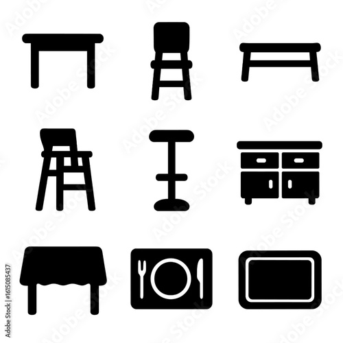 Dining Furniture Icons. Solid, filled icon set of energy management: power plant, battery storage, smart meter, energy audit,