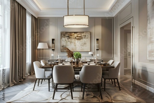 Dining room in an apartment in transitional style with neutral tones , created by ai