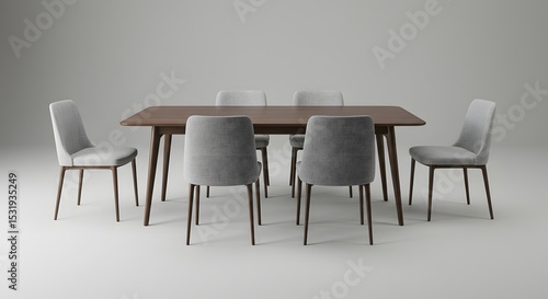 Dining Room Set with Wooden Table and Six Gray Chairs, Interior Design Photograph