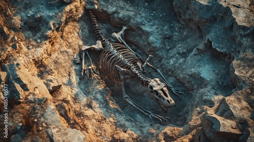 Dinosaur skeleton buried in rock: An excavation site where ancient remains are being uncovered from the earth