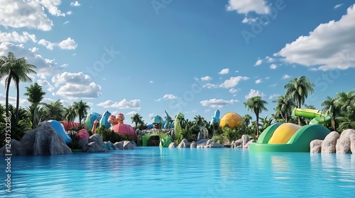Dinosaur theme park, realistic animatronics, prehistoric jungle, 3D illustration