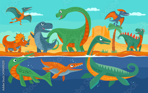 Dinosaurs, mountains, palm, cactus and sky with clouds. Vector flat illustration