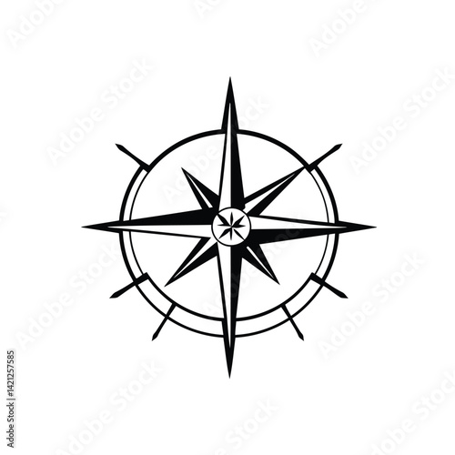 Directional brand logo black silhouette compass with sharp arrows, positioned centrally on a white background. The design features clean lines and a balanced geometric structure