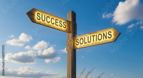 Directional signpost pointing towards success and solutions under a bright sky