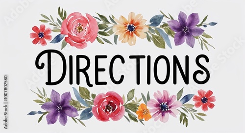 Directions word lettering with watercolor painting flowers on plain white background
