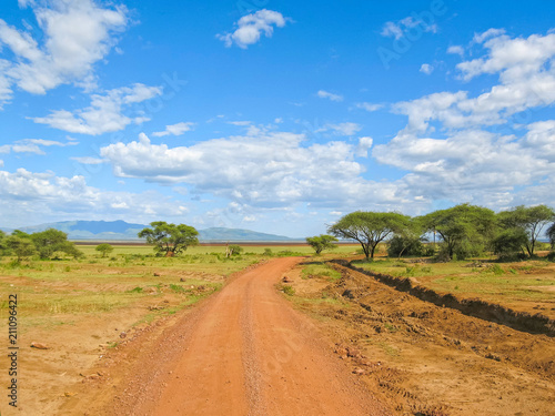 Dirt road in savanna plain. Lake Manyara National Park, Tanzania, Africa.