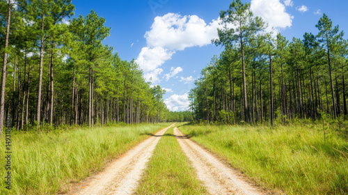 Dirt road winding through lush pine forest under bright blue sky creates serene and inviting atmosphere