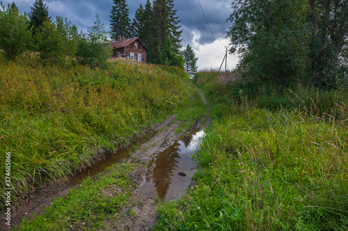 Dirt road with mud and puddles in a village with abandoned old wooden houses in northern Russia
