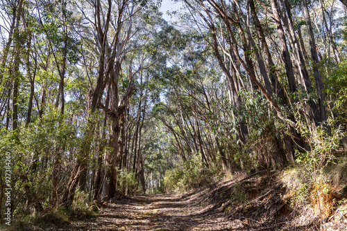Dirt track through the Australian bush full of eucalyptus trees, fallen bark and leaves. Dappled sunlight falls between the heavily forested native woods. Countryside near Hanging Rock in Victoria.