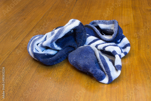 Dirty Blue Stripes Socks Left on Wooden Floor.