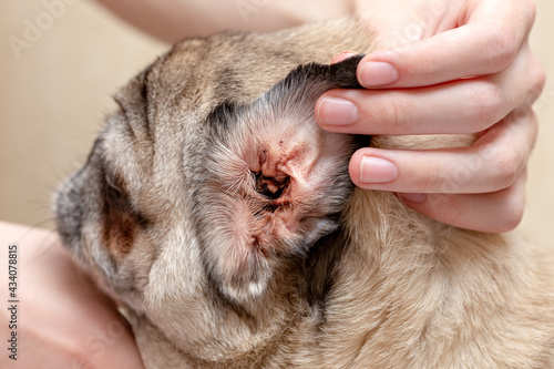 Dirty ear of a dog. A dog's ear affected by an ear mite.
