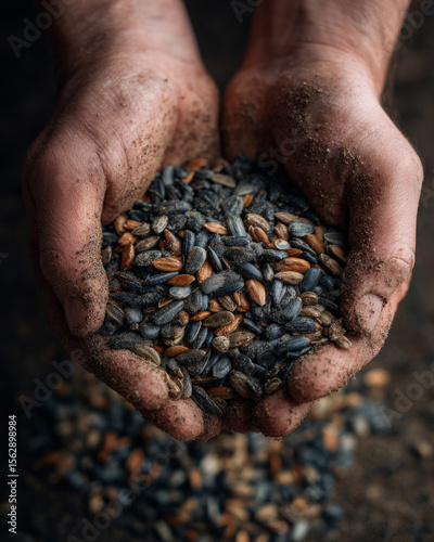 Dirty hands hold mix of heirloom seeds, showcasing nature bounty and care