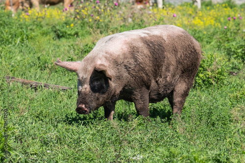 Dirty pig are grazed in the field