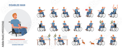 Disabled man poses vector illustration set. Cartoon bearded smiling male character with physical disability sitting in wheelchair, gesture or expression collection of disabled person isolated on white