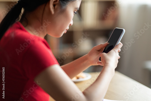 Disappointed adolescent asian girl female chatting in social networks on smartphone with empty screen