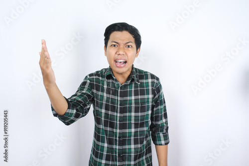 disappointed asian man raising hands with angry mad expression show questioning gesture isolated