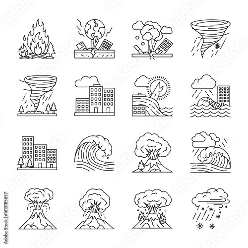 Disaster, weather hazard line icon set. Vector pictograms of natural and environmental calamities