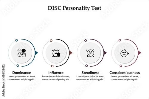 DISC Personality Test - Dominance, Influence, Steadiness, Conscientiousness. Infographic template with icons and description placeholder