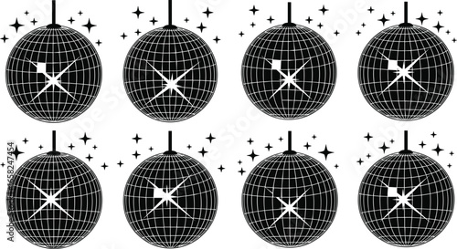 Disco ball pattern, sparkling grid design, retro dance icon, black and white illustration, party light reflection, vector seamless background