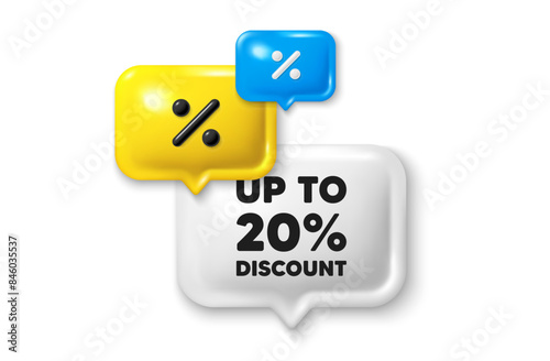 Discount speech bubble offer 3d icon. Up to 20 percent discount. Sale offer price sign. Special offer symbol. Save 20 percentages. Discount tag discount offer. Speech bubble sale banner. Vector