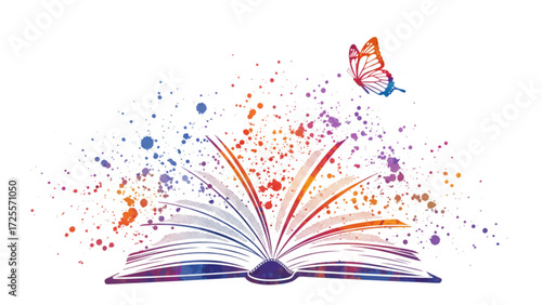 Discover vibrant knowledge and inspiration with an open book and butterfly, perfect for educational resources and creative projects with a colorful splash