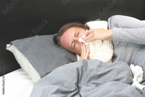 Disease. Home treatment. A woman is sick at home, runny nose and flu. Warmly dressed and covered with a blanket. Blows her nose into a napkin, runny nose. Infection, epidemic, bacillus carrier