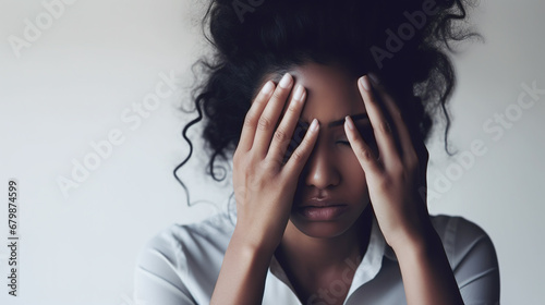 diseases and illnesses -woman with face distorted in pain or despair holds one hand over her face