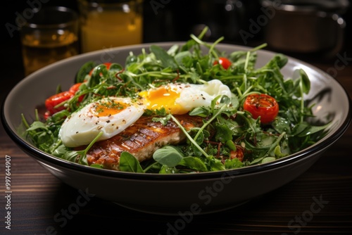 Dish with a dietary food. Cherry tomatoes, chicken breast, eggs, carrots, salad , generative IA