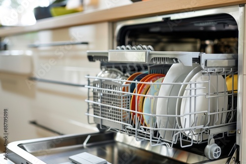 Dishwasher in modern kitchen. Washing dishes stock photo Dishwasher, Kitchen, Open, Door, Appliance